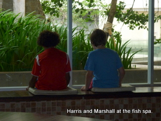 Our last adventure of the day was a visit to the Kenko fish spa at the local shopping mall. The pictures say it all – $30 Australian (RP 240, 000) for little fish to nibble our feet and legs. The boys totally enjoyed the experience.